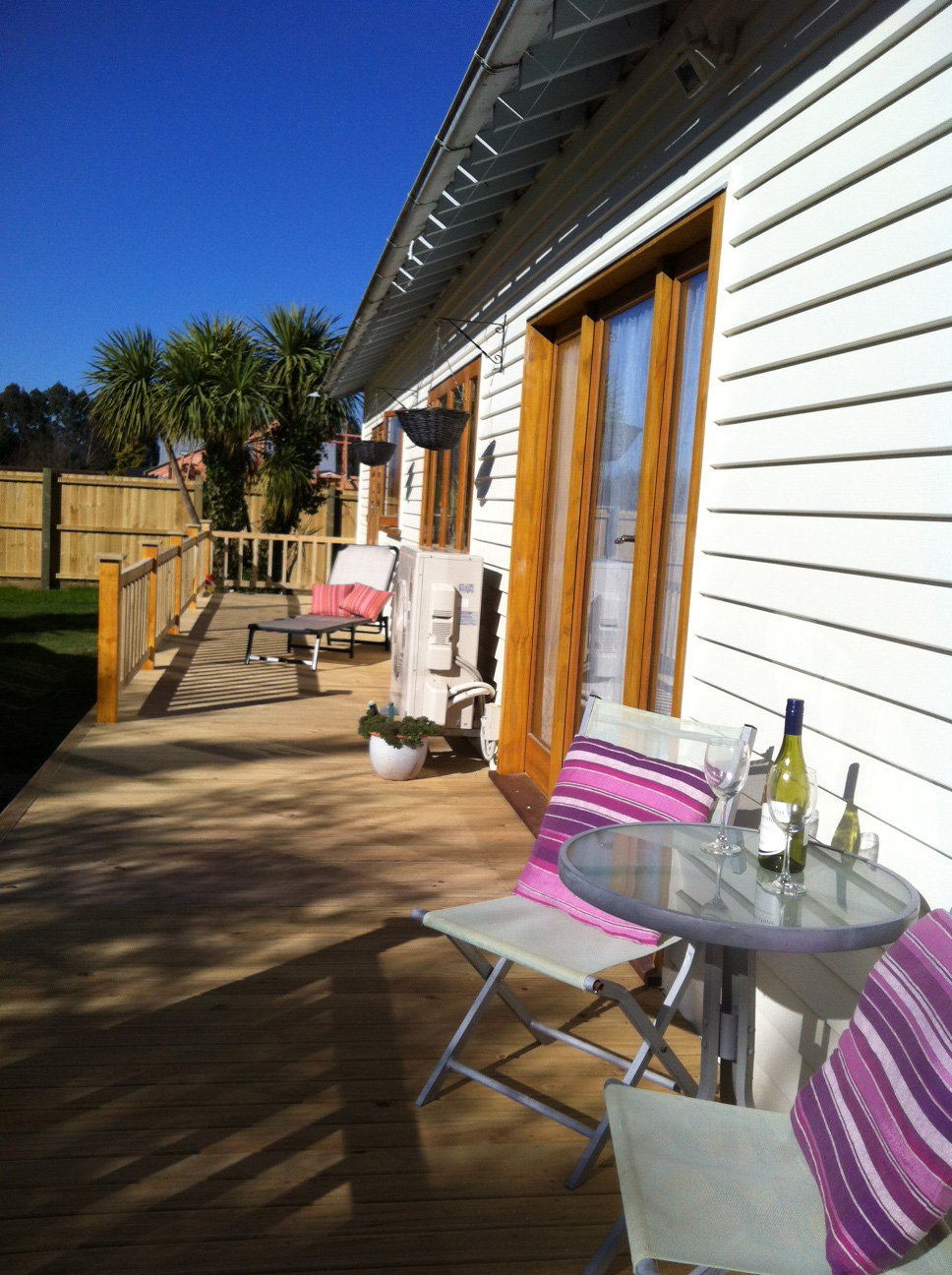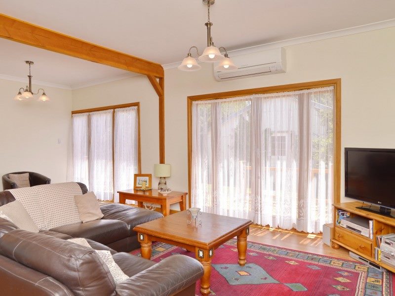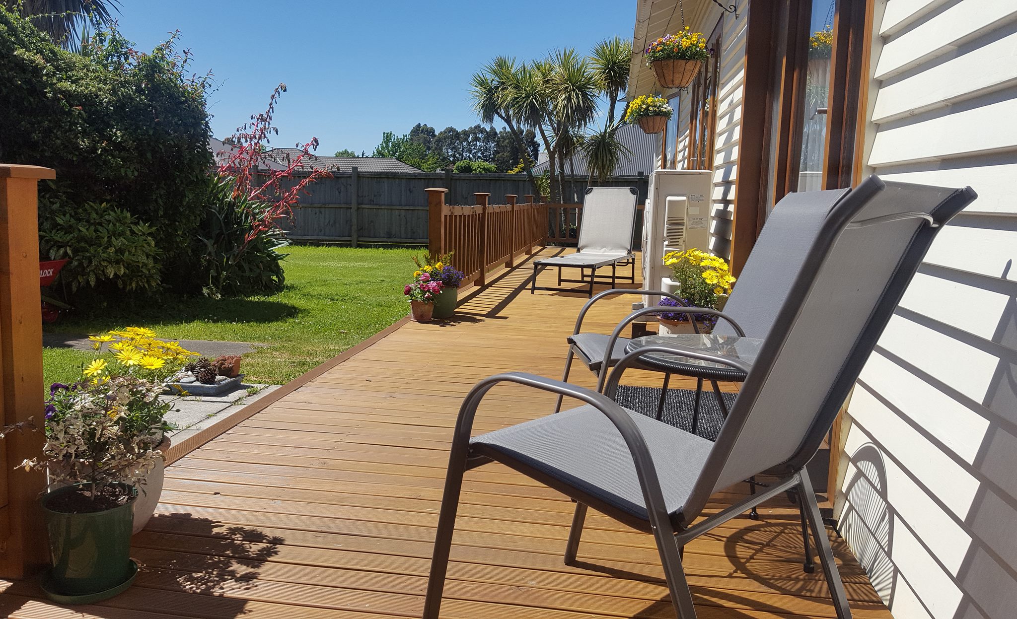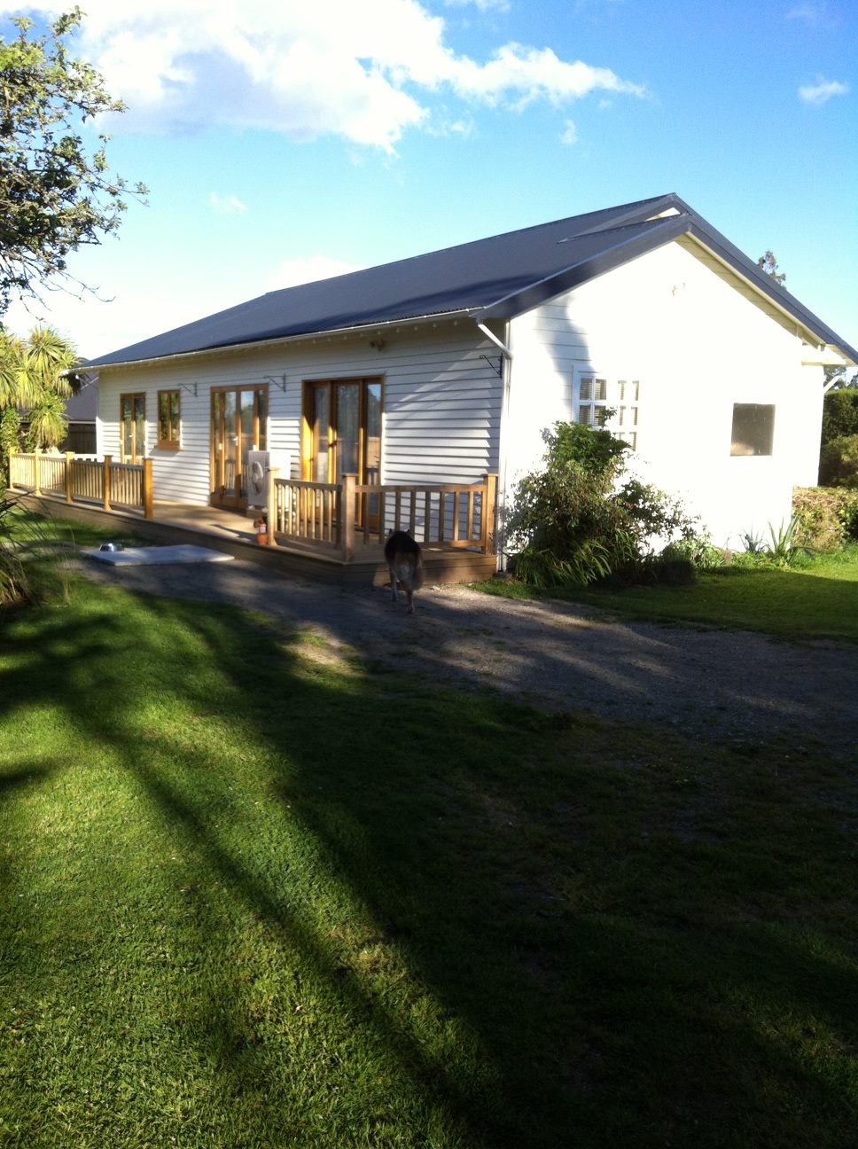 Weatherboard house, 4 bed, modern bathroom, laundry, open plan kitchen/dining room/living room & huge deck facing the sun! The house has been improved & upgraded over recent years to include a new kitchen/appliances, double-glazed windows & doors along one side, huge heat pump, rewired, replumbed, new roof..High ceilings & timber beams create a feeling of character & space. The huge deck provides extra entertaining space – perfect to sip wine or coffee!